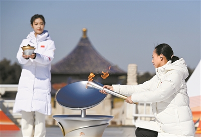 3月2日,北京2022年冬残奥会火种汇集仪式在天坛公园举行。在北京、延庆、张家口三个赛区采集的8个火种,连同在英国曼德维尔采集的火种,共9个火种汇聚生成北京2022年冬残奥会官方火种。仪式后进行了以“九天之火”为主题的天坛公园火炬传递。图为在天坛圜丘采集“夏奥之火”。