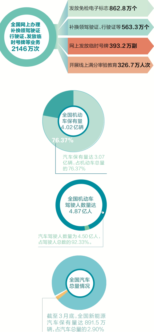 网上办理车辆和驾驶证业务2146万次。2022年一季度,为做好常态化疫情防控工作,各地公安交管部门继续大力推行31项交管业务“足不出户”网上办。全国网上办理补换领驾驶证行驶证、发放临时号牌等业务2146万次。其中,发放免检电子标志862.8万个;补换领驾驶证、行驶证等563.3万个;网上发放临时号牌393.2万副;开展线上满分审验教育326.7万人次。