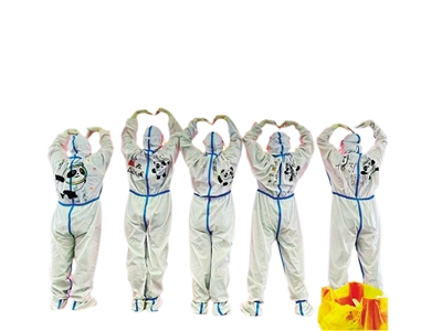 医护人员穿着孩子们画的“冰墩墩”秀爱心。