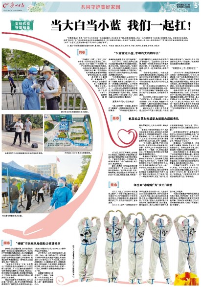 “在哪里集合?我来!”在广州4月的任何一次核酸检测中,无论是党员干部,还是普通群众,万众一心的应答在各个社区群、党员群里闪现。记者连日采访发现,疫情“防控战”中广州市民积极响应区域核酸检测号召,不少普通市民急赴一线做起了志愿者,与防疫一线工作人员共同组成了“疫”线牢不可破的铜墙铁壁,这些“大白”“小蓝”们,在街坊眼中留下不少动人心扉的“特写”。