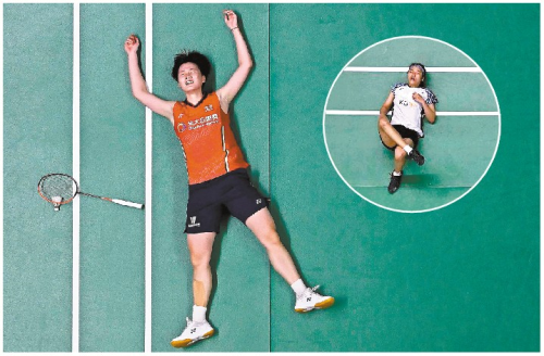 第一盘女单比赛,陈雨菲(大图)与对手拼尽全力,比赛结束后,双方都累得躺在地上久久不能动弹。@人民视觉