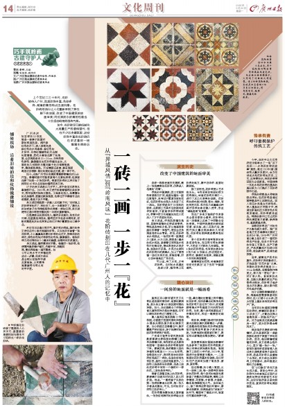 如今,这栋广州市历史建筑需重新修缮后对公众开放。修缮时要尽可能恢复每个元素的原样,包括踩在脚下的那一小块花阶砖。修复花阶砖的工序交给了拥有近40年从业经验的铺砖匠吴文进。