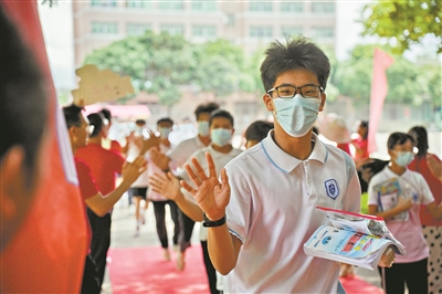 在顺德区成美初级中学,在昨日下午开考前,该校也为考生们举行了一场特别的“送考仪式”,给赴考学子加油打气。送考现场,学校校长、全体行政和初三级老师身着送考服,给每位考生逐一击掌打气。校方负责人介绍称,在考前几天,学校初三领导小组每天24小时都留守学校,关心学生的吃饭、休息和心理状态。“这些天来,初三级班主任全程悉心陪同,随时关注学生身心状态,努力给学生营造良好情绪氛围。”该负责人介绍说。