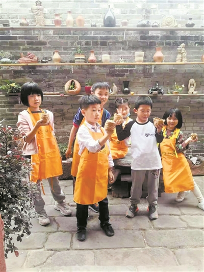 孩子们在展示自己的陶艺作品。