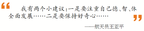 “你们在信中问我,除了学习和锻炼身体外,要从哪个方向努力?”对于学生们的提问,王亚平在信中表示:“我有两个小建议:一是要注重自己德、智、体全面发展,除了学习知识、锻炼身体外,也要努力提高自己的心理素质,良好的心理素质能帮助你们从容地应对学习和生活中遇到的各种挑战,不会轻易被困难和挫折打倒。二是要保持好奇心,好奇心是人类探索未知世界的内在动力,好奇心可以让我们发自内心地真正热爱上科学,你们将来投身探索浩瀚宇宙的事业中,就能取得丰硕的成果。”