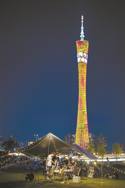 年轻人聚集在广州塔下露营。广州日报全媒体记者陈忧子 摄