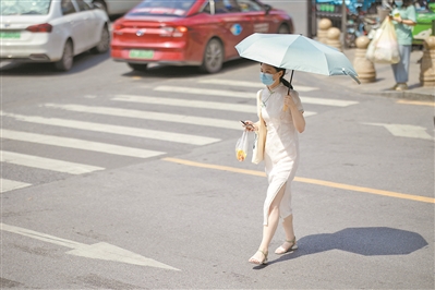 高温天气,市民在烈日下出行要做好防暑准备。 图/广州日报全媒体记者 陈忧子