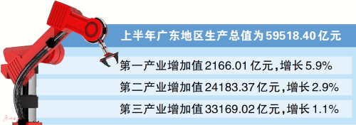 上半年,广东服务业增加值占地区生产总值比重55.7%。金融对实体经济支持力度加大,金融业增加值增长7.3%,增速比一季度提高0.5个百分点;6月末金融机构本外币贷款余额增长12.3%,其中,企(事)业单位中长期贷款增长14.2%,存款余额增长9.7%。