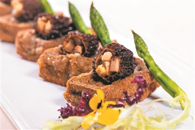 食用菌本是素物,多数情况下,厨师们会用肉类来配搭它,以令其更加滋味。实际上,素与素的配搭,也能别有惊喜。广州康莱德酒店韵轩中餐行政总厨孙伟伦师傅便以羊肚菌配搭豆腐,撞出巧妙食感。羊肚菌有“素中之荤”的美称,其中又酿入菇粒,这菇粒是用孙师傅研发的黑松露酱炒香的。不似其他黑松露酱那般失真,出自他手的酱,香得自然,丝毫无冲鼻之势,再配以豆香味浓厚的自制黑豆豆腐,美味而无甚负担。