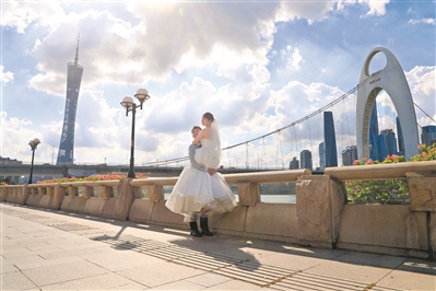 太阳热辣如火,仍有情侣不惧炎热,在珠江边拍摄婚纱照。