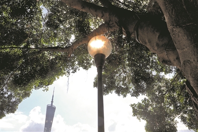 阳光照在路灯上,灯里好像有了一个小太阳亮了起来。 广州日报全媒体记者骆昌威摄