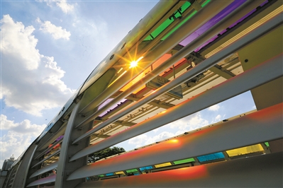 烈日下,有轨电车站的棚顶色彩斑斓。