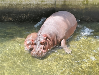 河马在泡冷水澡“避暑”。广州日报全媒体记者杨耀烨 通讯员王益摄