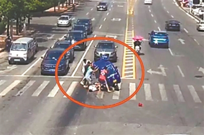 这时,停在中间车道的第3辆小车中,从副驾驶室走下来一位男子;旁边的车辆中又先后下来4人,他们不约而同地跑向事故车辆,合力将压在骑手身上的三轮车抬起扶正。此时交通信号灯已变绿灯,为了不影响正常交通通行,在确认两人都没有大碍后,5人转身驾驶各自的车辆离开现场,犹如一次“快闪”。