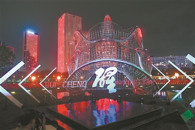作为千灯湖新地标《醒》,大有来头。其设计者是央美品辰以及佛山狮头(彩扎)国家级非遗传承人欧琦辉,通过公共艺术方式进一步提炼南海醒狮文化精神。2022年北京冬奥会视效导演组导演、新媒体艺术家曹雨西也专门为《醒》设计了新媒体灯光秀,并配有原创音效,简约线条结合灯光投影,让“醒”蕴藏更多互动、动感的可能。