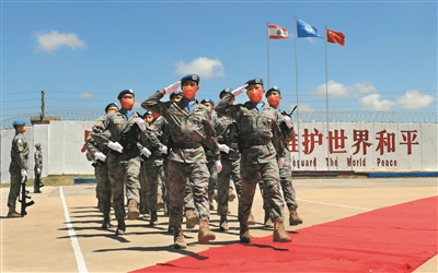 在黎巴嫩南部辛尼亚村的中国维和部队营区,中国维和部队官兵在受勋后通过观礼台(2022年7月1日摄)。新华社发