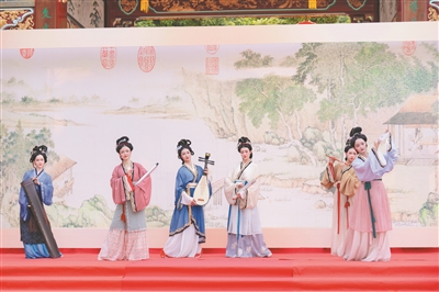 一幅千年古画神奇“复活”,仕女乐队携琴从画中走来,翩翩起舞,将中国古典文化传奇娓娓道来……记者获悉,今年国庆节期间,番禺区宝墨园景区以北宋著名画家范宽的《携琴访友图》为创作灵感,巧借“携琴”主题,以“人画合一”形式呈现给观众。
