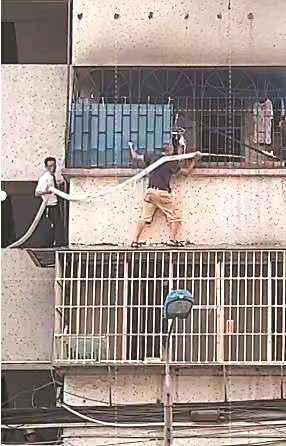 一口气跑到事发三楼楼道时,周求清看到已有多名街坊正打算使用楼道里的消防栓灭火。“让我来,让我爬过去灭火吧!”周求清主动要求扛起水带爬去起火阳台灭火。当时,他记得有名穿着白色衬衣的街坊建议他别这么做。“对方和我说这样做很危险。但我当时还是爬过去了,我还是有把握自己不会掉下去的。”周求清说。