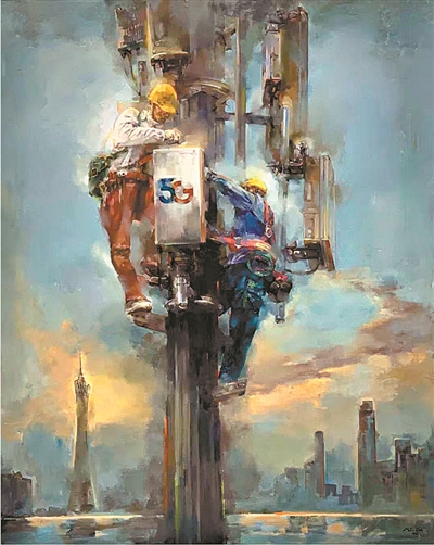 展现5G技术、人工智能等领域的作品也出现在本次展览中。崔弥莱作品《助力新速度》以两名建筑工人正在修建5G基站为视角,展现了城市建设者为5G时代助力的社会图景,“背景中‘小蛮腰’等元素则是广东有代表性的建筑地标,表现了广东热情拥抱5G时代。” 崔弥莱说道。