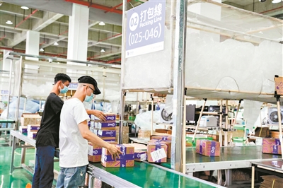 昨日,在全面恢复正常作业的南沙综合保税区内,跨境电商仓库内工作人员正在加班加点处理货品,一批批来自全球各地的跨境电商商品理货后上架,分拣员在货架间穿梭拣件,打包台前打包、贴快递单;一辆辆大货车满载发出,将货品送到国内千家万户。