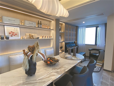 以主打改善型产品的新盘开控城投云锦来看,120多平方米、140多平方米的样板房都大量运用暖灰色、米色和多元化的建材,以优雅轻奢格调,搭配潮玩艺术装置,交织出简洁而又富质感的空间。梁志天设计师有限公司设计董事李蔚然表示,通过设计可以打破空间界限,营造适应多情景的生活空间,输出新的生活主张和方式。云锦项目入户后客厅与餐厅相贯通,米色系亲肤板一直延伸至餐厅,一气呵成地连起两个空间。空间动线的设置串联起生活美学、社交关系、休闲娱乐等多种形态。