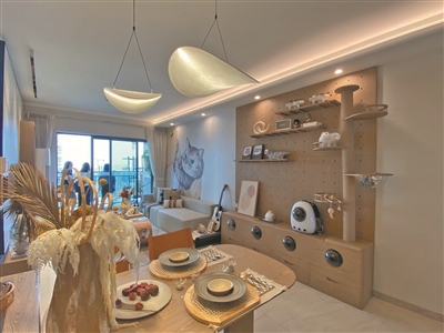 值得关注的是,这一轮新亮相的样板房中,越来越多出现宠物元素,样板房如何安置萌宠的探索也不少。凯德山海连城新亮相的样板房干脆直接在客厅安置了半面墙的猫窝和活动空间,让不少爱猫人士大呼喜欢,表示可以参考复制。