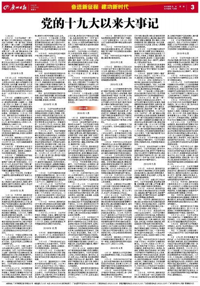 1月11日-13日 十九届中央纪委三次全会举行。习近平总结改革开放40年管党治党的经验,指出必须不断进行自我革命,同一切影响党的先进性、弱化党的纯洁性的问题作坚决斗争,实现自我净化、自我完善、自我革新、自我提高。赵乐际作工作报告。