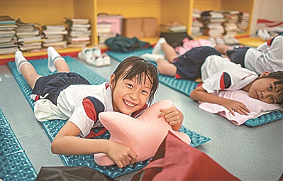 2021年,“双减”政策落地,学生逐步减负,广州开发区第二小学学生刘思含和同学在室内准备午睡。