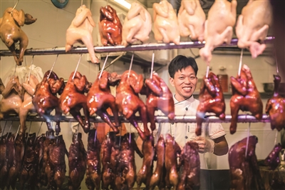 食肆小哥眼见油亮亮、香喷喷的烧腊出品,笑容里是劳有所得的满足;