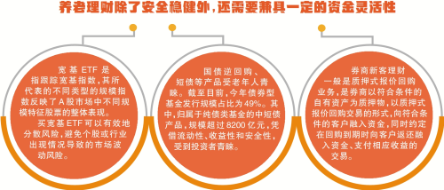 近日,记者走访了解到,对具有一定投资经验的老年人而言,养老理财除了安全稳健外,还需要兼具一定的资金灵活性。有金融业内人士建议,可以通过分散配置债券型基金、货币基金等产品,满足不同情景下客户对资金收益率和灵活性的需求。同时,购买债券型基金时尽量配置波动率最小的纯债产品,期限选择上尽量以短期为主,满足老年人安全稳健的心理预期。