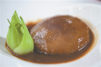 经过长时间煨泡,柚子皮本身的筋络变得更加柔顺,味道也更加香浓。这时候淋上主厨特调的酱汁,这样做出来的“虾子扒柚皮”味道浓郁,口感软嫩,上桌前便有香气开路,未见美食,已让人垂涎欲滴,食指大动。