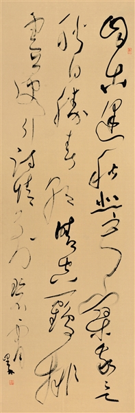 草书的书写除了临池不辍之外,更需要字外之功,对于草法的研究,甚至要上溯篆隶来了解字体演变的规律。同时,草书的创作需要书法家感悟自然,从自然形态中体悟书法形态的变化。如唐代书法家张旭从“孤蓬自振,惊砂坐飞”中悟得书法奇崛之态,从公孙娘舞剑悟得低昂回翔之状。唐人释亚栖从“飞鸟出林,惊蛇入草”中悟得笔法纵横之道。罗峰林的大草书法,正是墨池功深,再参以造化为师,方领悟草书真谛——以气驭笔,笔走龙蛇,有得意忘形的妙处。虽狂放,而不失法度。同时,罗峰林注重墨法,尤其枯墨的运用,有飘然出尘之感,让人回味无穷。