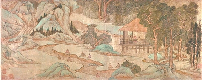 《兰亭修禊图》卷,描绘了王羲之和文人墨客兰亭雅集时的情景。文徵明(明)