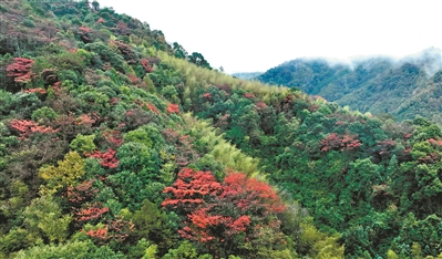 在始兴县北山,红叶似“火炬”般,一簇簇、一团团,点缀在葱茏的翠竹、绿树间。山峦中,红绿颜色交织在一起,有一番冬日秋韵入画来之感。