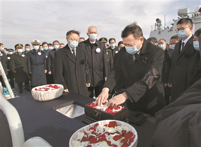 十二月十一日,遵照江泽民同志及其亲属的意愿,敬爱的江泽民同志的骨灰在长江入海口撒入大海。受党中央委托,中共中央政治局常委、中央书记处书记蔡奇等领导同志和江泽民同志的夫人王冶坪等亲属护送骨灰撒放。 新华社发