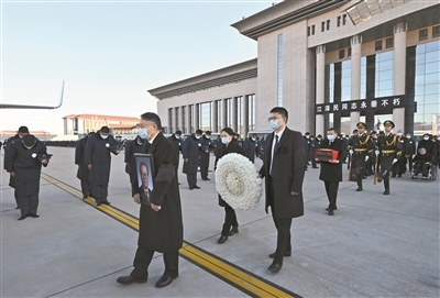 十二月十一日,遵照江泽民同志及其亲属的意愿,敬爱的江泽民同志的骨灰在长江入海口撒入大海。受党中央委托,中共中央政治局常委、中央书记处书记蔡奇等领导同志和江泽民同志的夫人王冶坪等亲属护送骨灰撒放。这是在北京西郊机场,江泽民同志的亲属捧着遗像、骨灰盒和花圈,缓步走向专机。新华社发