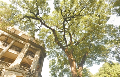 这棵古树的树干粗壮,树皮均匀开裂,,树冠枝叶翠绿,长势良好。它“安居”于沙面岛上,一年年“看着”云卷云舒,朴实无华,十分内敛。据说樟树有信守承诺的寓意,相传以前常有人在这棵香樟树下结拜,留下了一些美丽的故事。