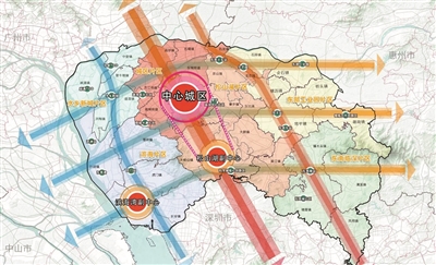 《总体规划》提出打造“三纵三横”发展走廊,形成“田字形”发展骨架,着力形成“一主两副六片区”的城镇体系。其中,石龙镇原为松山湖片区,被划入城区片区;黄江、东坑,原为东部产业园片区,现在则被划入松山湖片区。