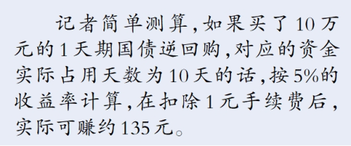 广州日报讯 (全媒体记者 王楚涵)临近春节,投资者将目光投向了国债逆回购产品。记者了解到,结合今年春节假期的安排,如果投资者在1月19日下午三点半之前买入1天期国债逆回购产品,可享10天利息。与此同时,余额宝、微信零钱通等发布温馨提示,在1月19日下午三点前转入资金,春节假期可持续享收益。在基金买入方面,在1月19日下午三点前买入,可按1月19日基金净值计算,1月20日确认(该规则适用于普通基金,QDII、香港基金、FOF基金的买入确认时间以页面提示为准)。