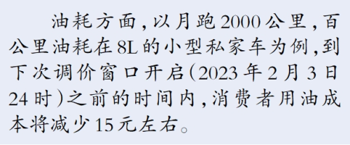 本轮成品油零售价格下调政策落实之后,春节期间居民消费用油成本将小幅下降。以油箱容量在50L的家用轿车为例,加满一箱92#汽油将较之前少花8元左右,95#汽油少花8.5元。物流行业,以月跑10000公里,百公里油耗在38L的重型卡车为例,在下次调价窗口开启前,单辆车的燃油成本将减少366元左右。