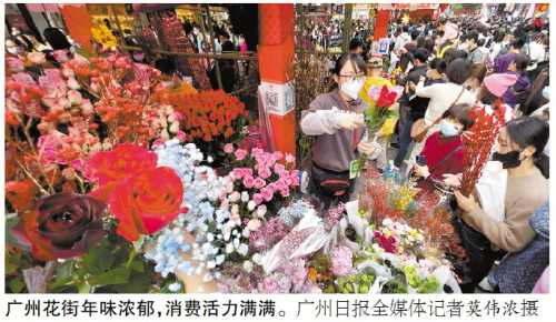 “年卅晚,行花街”。近几日,广州的花街火出圈,成为国内新春年味代表。与年味齐飞的,则是市场强劲的消费力。