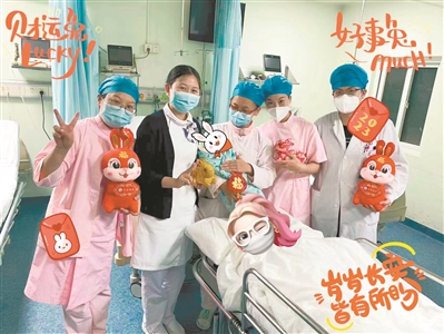 “你家宝宝很秀气又文静,皮肤真白,长大以后肯定很聪明。”助产士们的夸赞让满头大汗的妈妈疲倦顿消,她迫不及待地接过宝宝,紧紧揽入怀中。(广州日报全媒体记者陈治家 通讯员梁蕊摄)