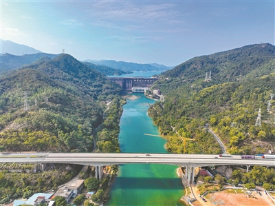 在建的长深高速河惠段改扩建项目——新丰江大桥航拍图。