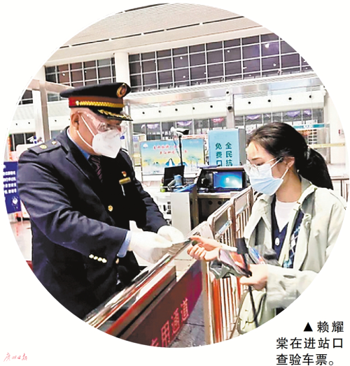 广州日报讯 (全媒体记者于敢勇 通讯员洪艺珍摄影报道)今年56岁的赖耀棠是肇庆火车站的一名客运员,也是一名老党员。自1984年入职以来,赖耀棠在一线岗位上坚守了38年。作为客运员,他的日常工作就是负责组织旅客乘降,确保旅客出行安全。春运高峰期,他依然坚守工作岗位,任劳任怨。