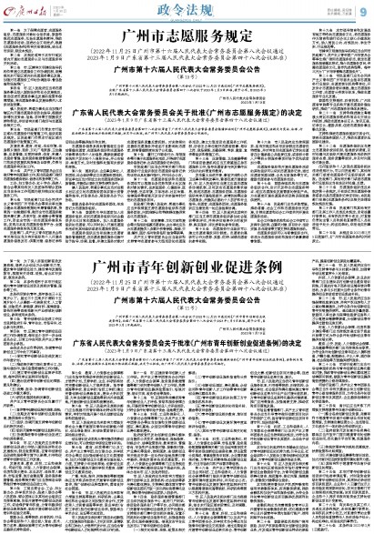 广州市第十六届人民代表大会常务委员会第八次会议于2022年11月25日通过的《广州市志愿服务规定》,业经广东省第十三届人民代表大会常务委员会第四十八次会议于2023年1月9日批准,现予公布,自2023年3月5日起施行。
