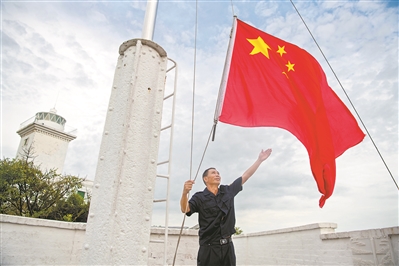 七点,迎着朝阳,夫妻俩将升国旗作为每天最重要的仪式。黄灿明换上制服,在用收音机播放的国歌声里,庄严地升起国旗。“每天7点升国旗,18点降国旗,除了台风天我们雷打不动。”黄灿明说。