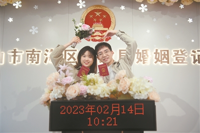 2月14日,不少新人在南海区婚姻登记处登记结婚,记录难忘时刻。广州日报全媒体记者陈枫摄