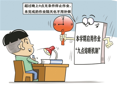 最近,常州市一小学启用作业“九点熔断机制”,即超过晚上9点无条件停止作业,未完成的作业隔天不用补做。这一举措听起来着实令人心动,如若能落实到位,可以减少学生不必要的作业负担,保障充足的睡眠。但需注意的是,这一机制还应得到教师和家长配合,才能保证作业有效进行和到点“熔断”。 (申时行)