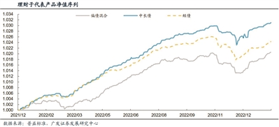 从净值情况来看,各类理财子代表性产品净值经历短暂平台期后恢复上涨趋势,偏债混合及中长债代表产品合成净值超越2022年年内高点。广发证券固收团队指出,春节之后第一周伊始(1月30日起),各类代表性产品合成净值增长再次提速。1月30~2月8日,偏债混合、短债、中长债理财产品合成净值区间收益率分别为0.19%、0.15%、0.09%。