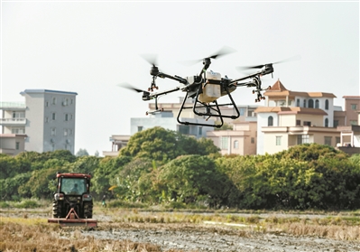昨日,在钟落潭镇湴湖村的水稻田上,整地机、无人播种机正在进行春耕作业演示。